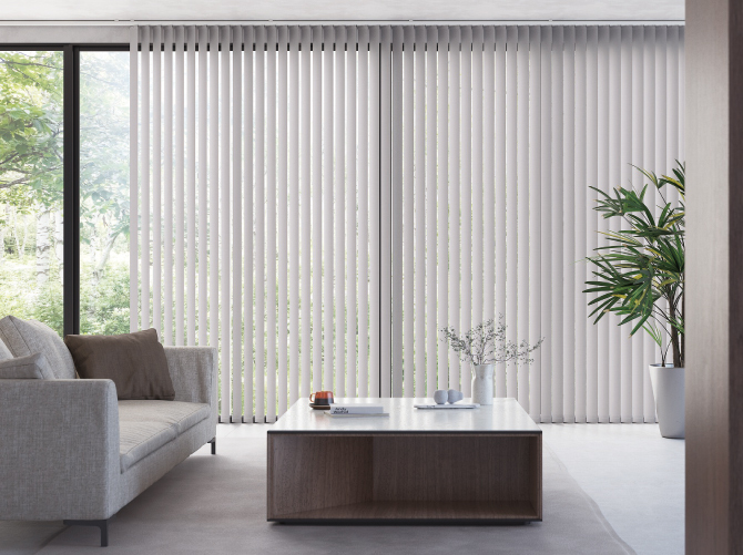 レースカーテンと厚地カーテンの組み合わせは定番ですが、最近は シースルー生地のロールスクリーンや **バーチカルブラインド(縦型ブラインド)**を採用するケースも増えています。